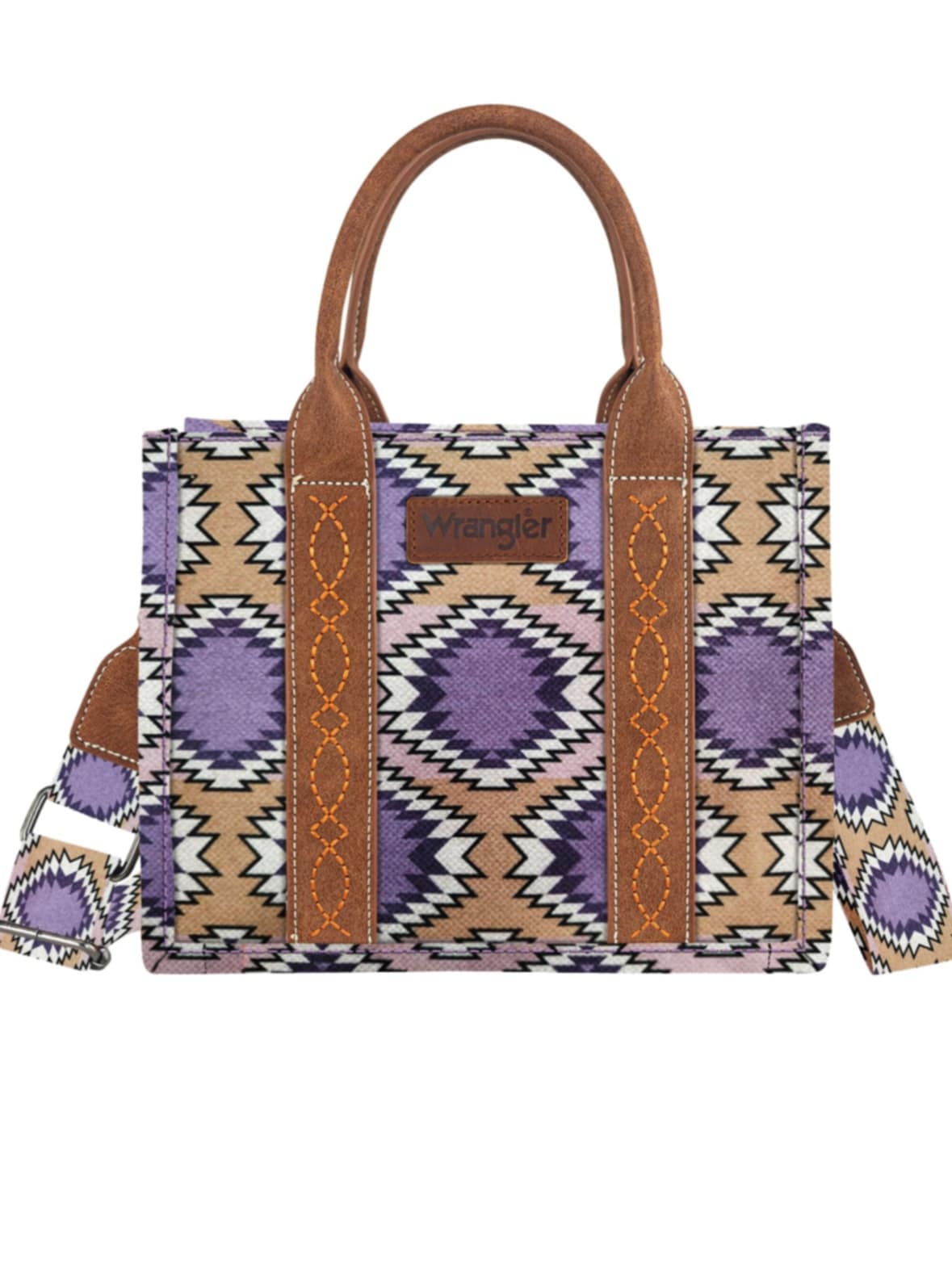 • Aztec pattern print on canvas • Whipstitch detailing • Top zip closure • Detachable and adjustable printed crossbody strap • Contrast handles • Internal zip pocket and slip pockets • Wrangler® iconic logo badge