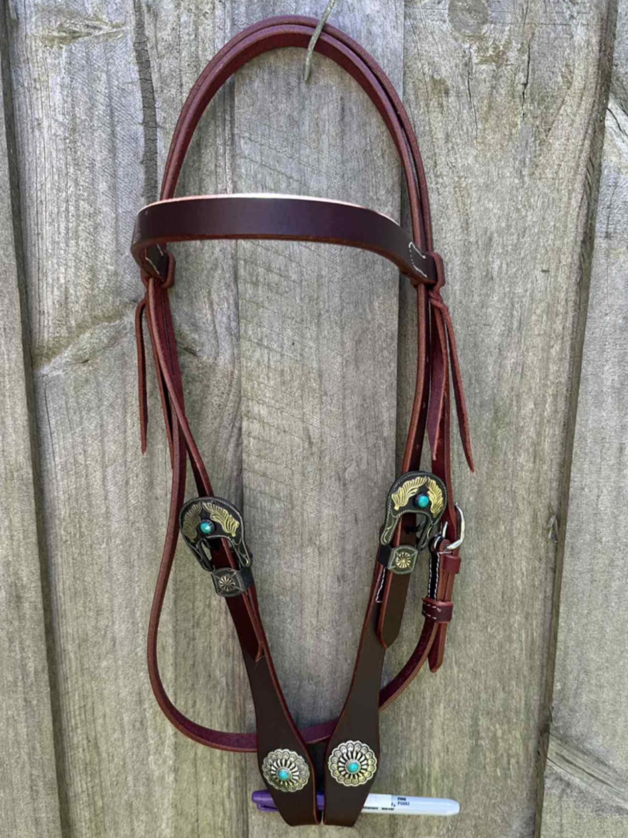 Designed for easy adjustment and a secure fit, it features dual cheek buckles in an antiqued silver finish, each accented with stunning turquoise stones, adding a subtle yet eye-catching Southwestern touch. The browband design provides a classic look while ensuring stability during rides.
