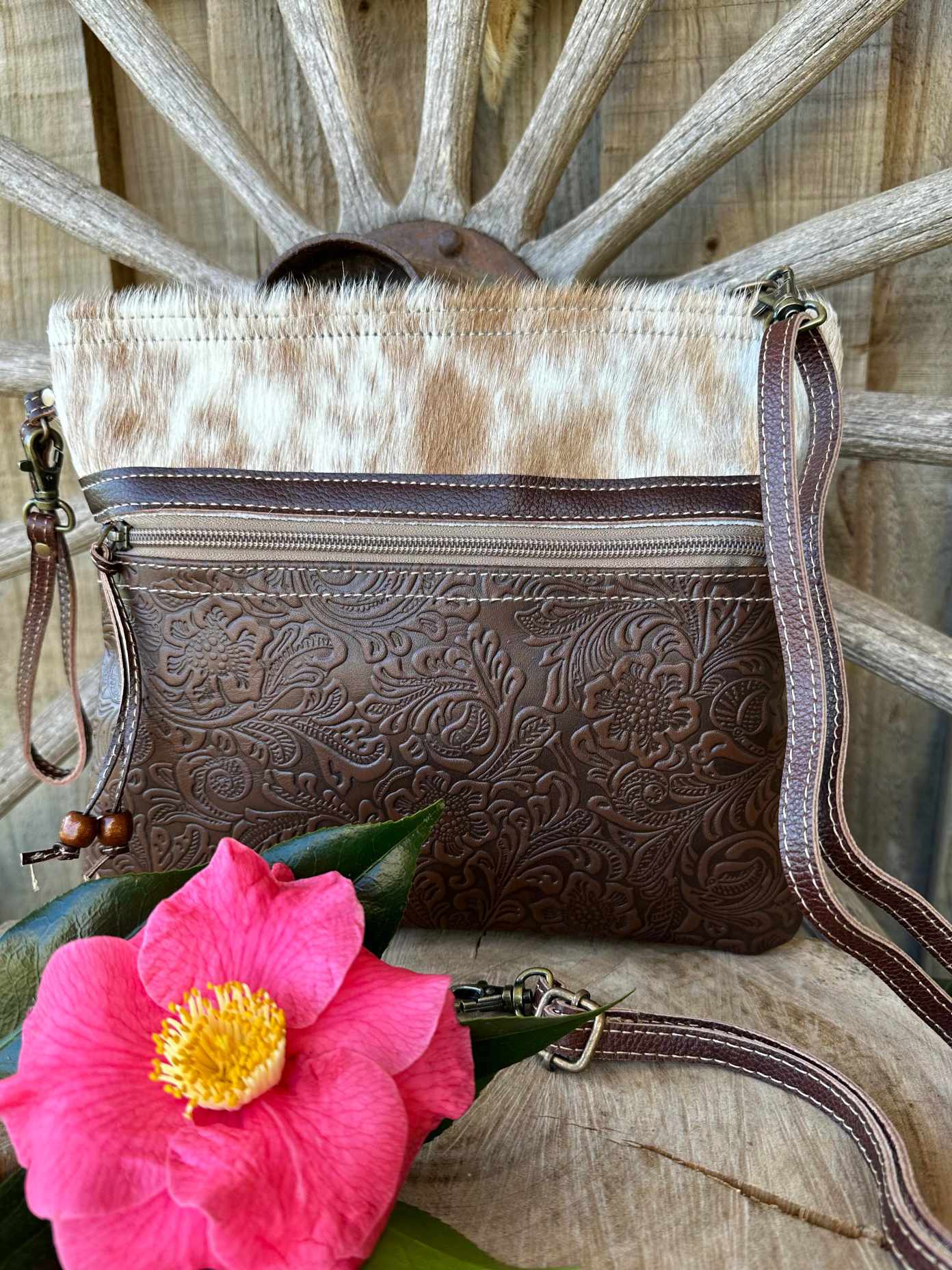 Western Hide & Tooled Leather Taurus Purse Zip Around Style