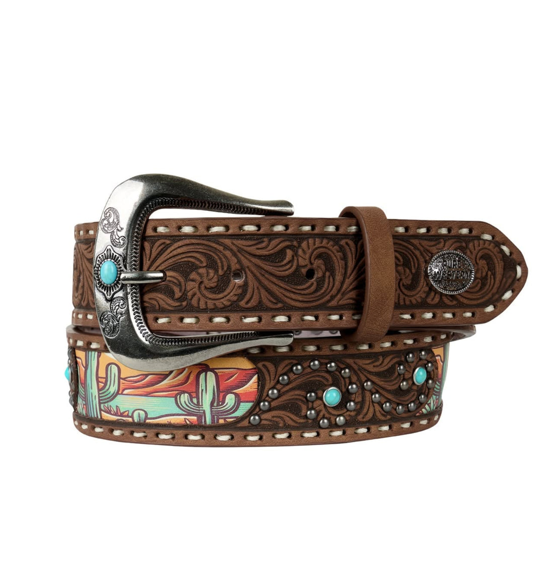 PU / Leather Tooled strap, printed cactus inlay design, turquoise and dome studs, handlace edging, removable buckle, Pure Western concho, antique silver hardware