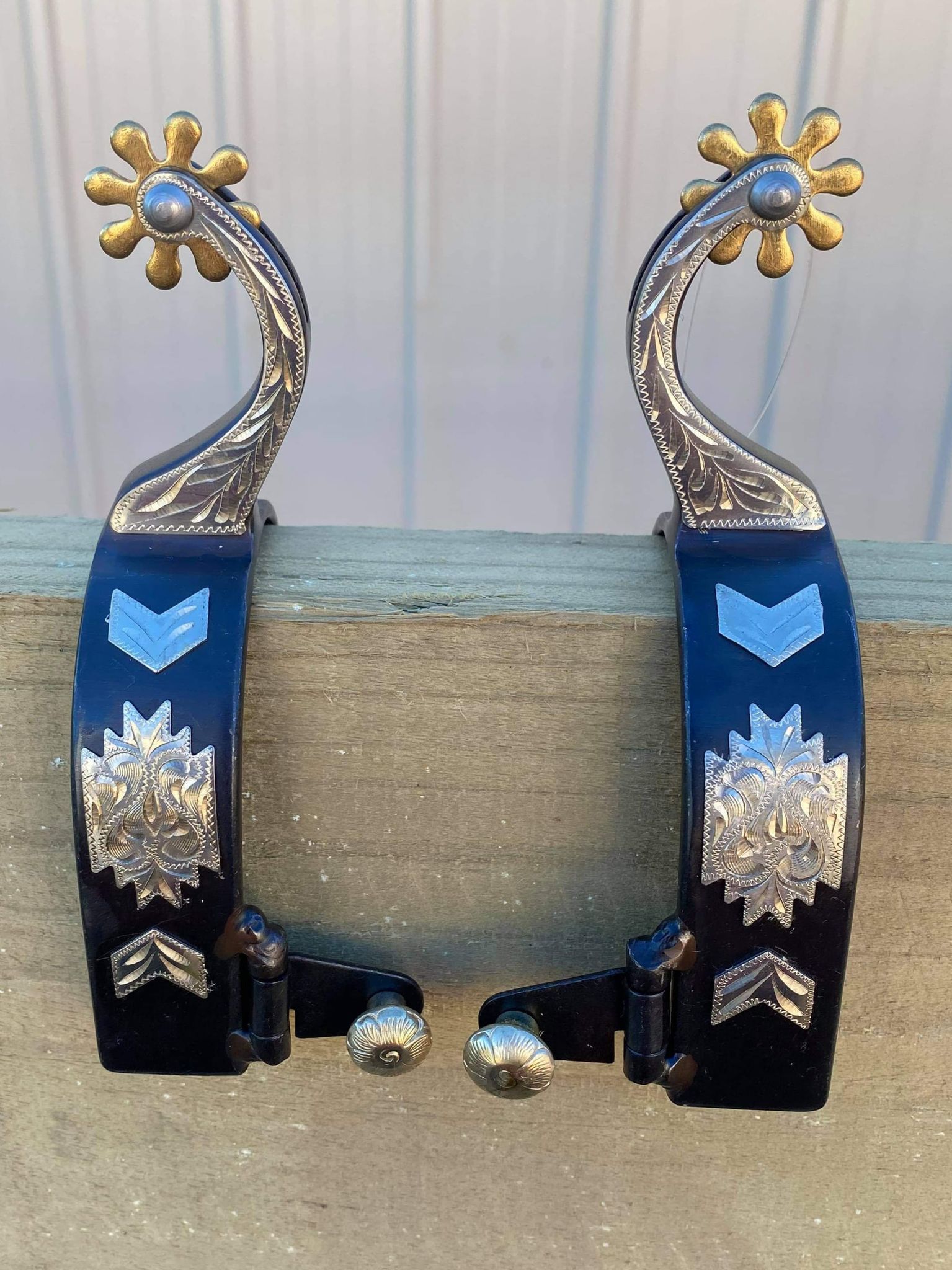 Spur details: 3/4" band, 2" shank including rosebud rowel and 3" boot opening