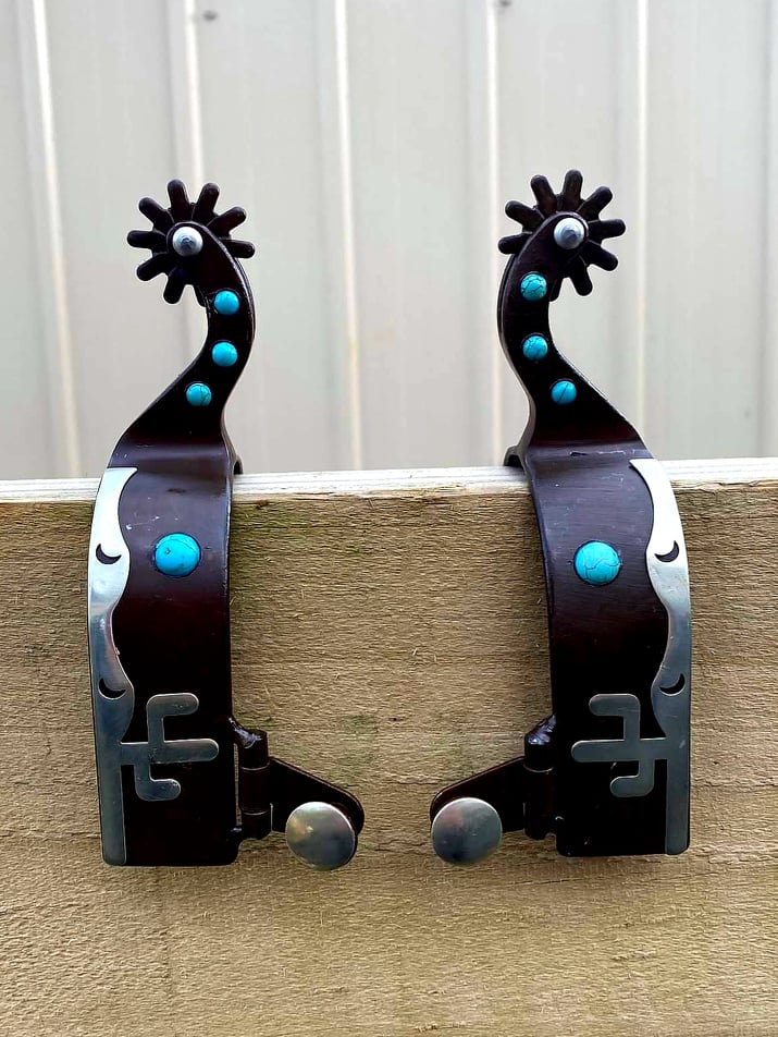 black steel spur with 1" band and 2.5" shank. Details are engraved silver "poker hand" and bar accents.