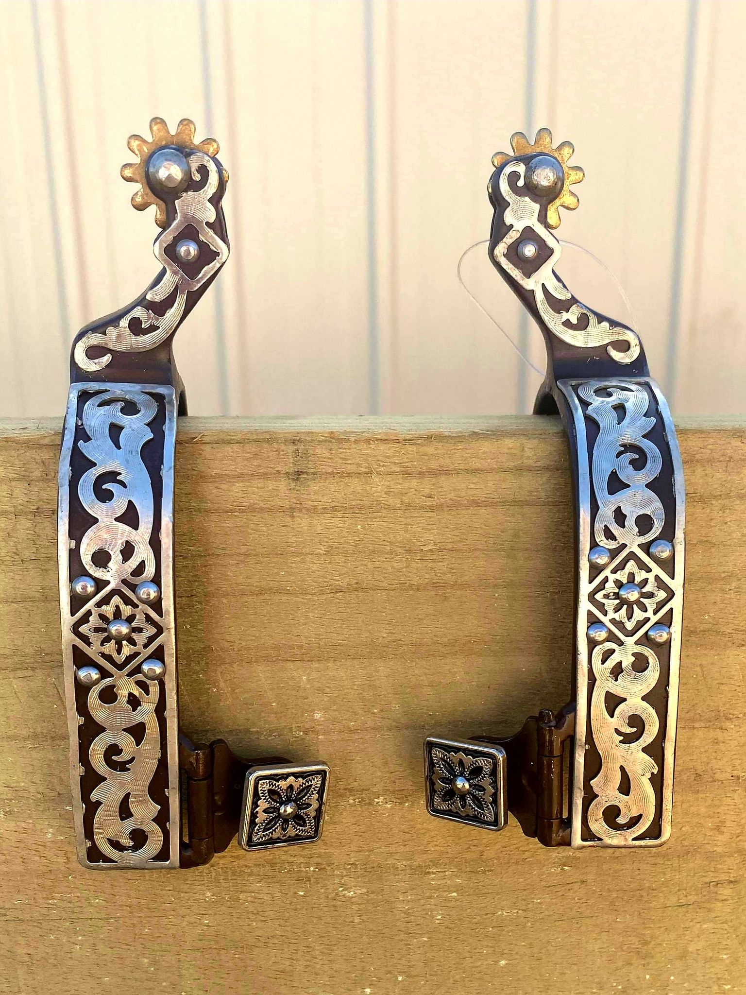 Spurs - Ladies black steel spur with engraved silver overlay and copper studs