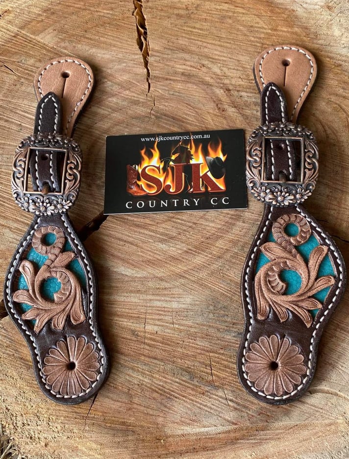 Showman ® Ladies Sunflower Tooled Spur Straps with buckstitch trim. These spur straps feature dark brown leather with a tooled sunflower inlay and natural buckstitch trim. Accented with brushed copper engraved buckles conchos with leather tassel.
