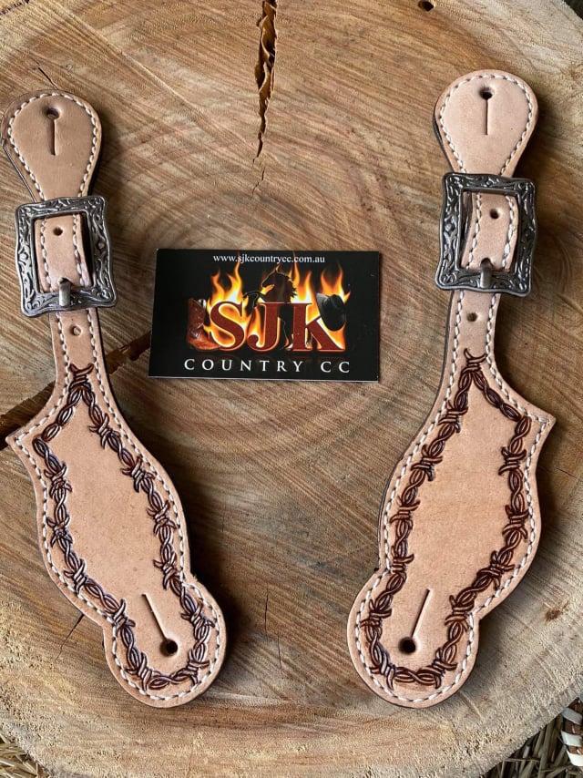 Ladies size floral tooled spur straps. These straps feature dark brown leather with a floral tooled design. Spur straps come with bronze buckles. Adjusts 10"-11".