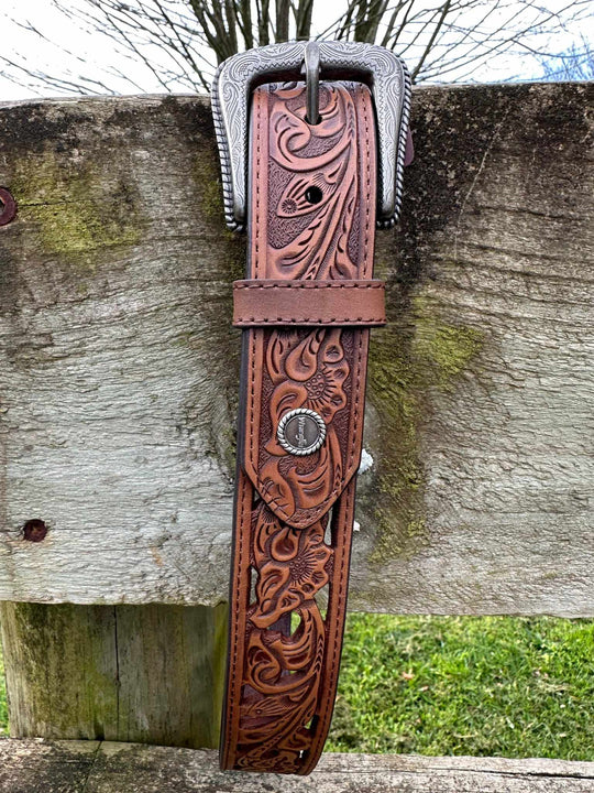 Tooled strap design with cutout, Wrangler® iconic logo concho, antique silver hardware